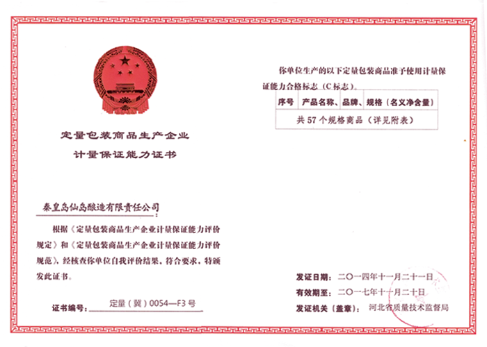 定量包裝商品生產(chǎn)企業(yè)計(jì)量保證能力證書(shū)